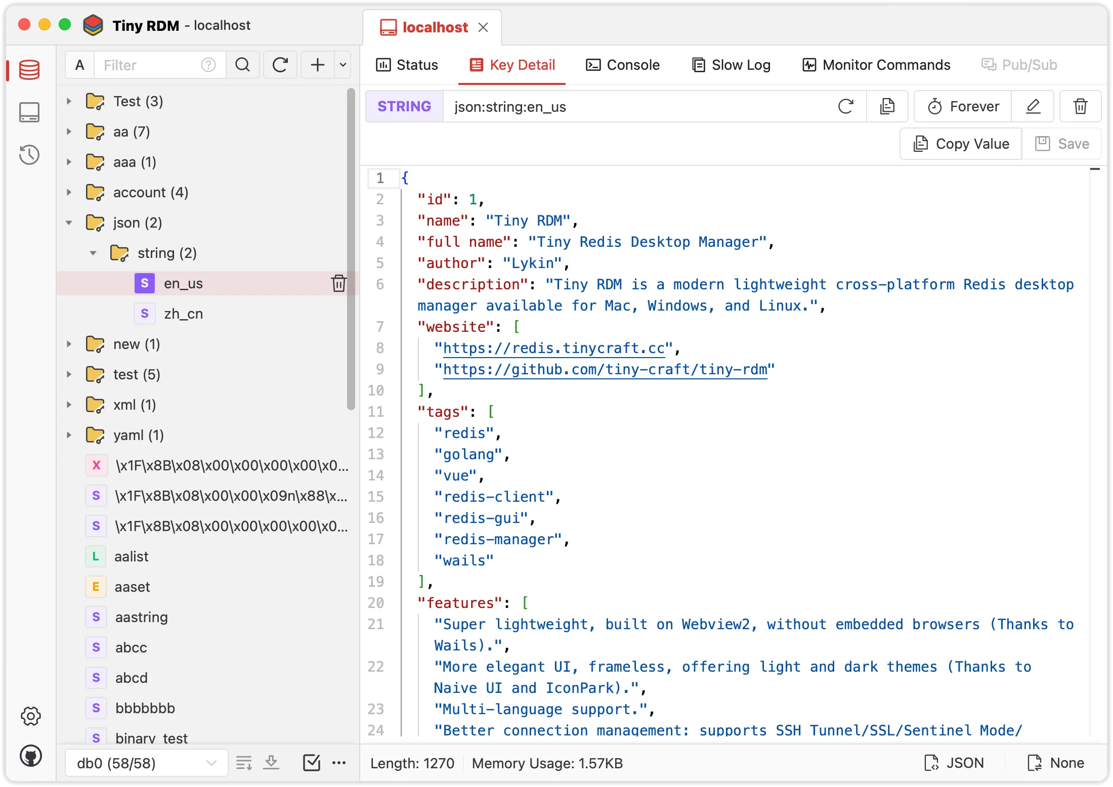 L'application Tiny RDM est une interface Redis moderne et open-source. Il possède une interface utilisateur magnifique, une gestion de base de données Redis intuitive et compatible avec Windows, Mac et Linux. Il fournit des opérations visuelles de données de clé-valeur, supporte diverses options de décodage et de visualisation des données, possède une console intégrée pour exécuter des commandes, des requêtes de log lentes et plus encore.
