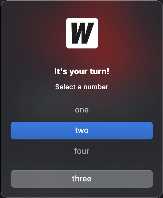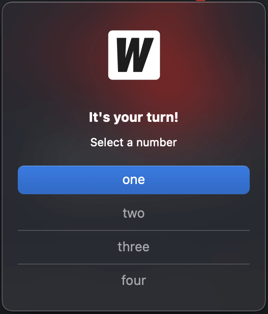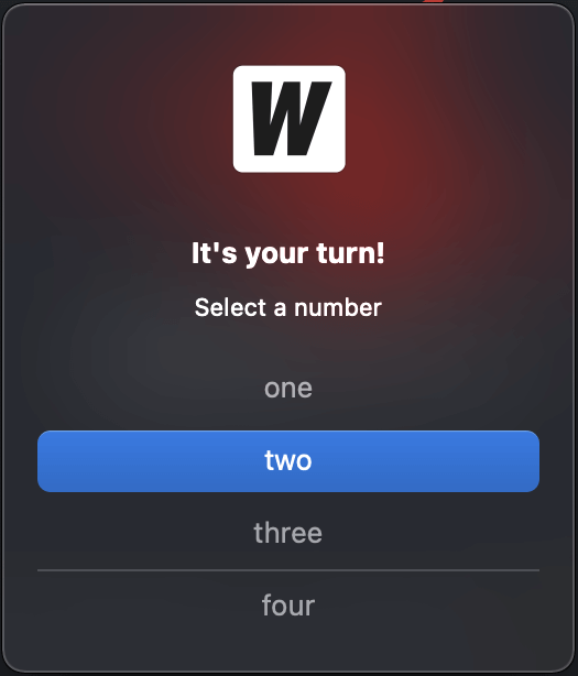 2番目のボタンがデフォルトになります。 このときreturnキーが押されると、返り値として"two"が返却されます: